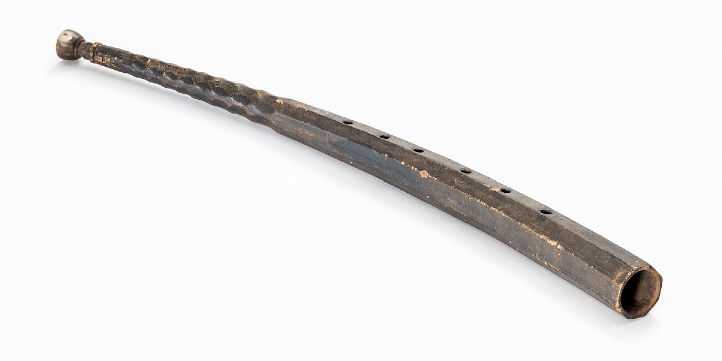 The instrument in the Deutsches Museum is a "Krummer Zink". It has an octagonal body that is bent to the right. Inside you can see that it is made of two parts that were glued together and covered with leather. The cup-shaped mouthpiece is made of horn and corresponds to a small trumpet mouthpiece. It is not known when the instrument was made, as tines are generally neither signed nor dated and therefore lack any clues.