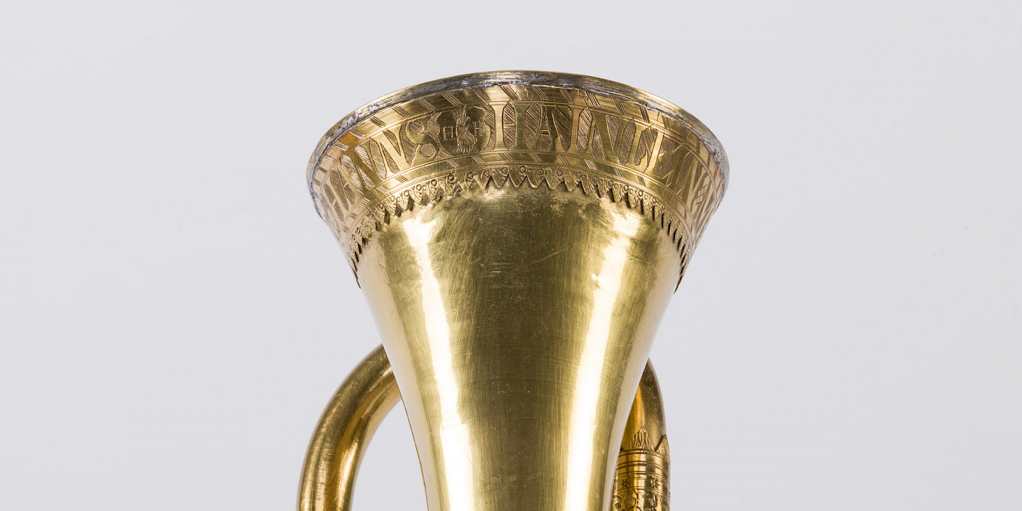 Die Trompete steht wie wohl kaum ein anderes Musikinstrument sinnbildlich für ihre Repräsentationsfunktion in Kirchen, bei Hofe sowie bei den Räten der aufstrebenden Städte. Traurige Tatsache ist daneben aber auch, dass ein zahlenmäßig weit größerer Bedarf an Trompeten für militärische Zwecke bestand. Hanns Hainlein erschuf dieses Exemplar auf dem Höhepunkt des Dreißigjährigen Krieges, der das Nürnberger Umland ins Fadenkreuz einer der wichtigsten Schlachten und eines monatelangen Belagerungs- und Zermürbungskrieges rückte: Im Jahr 1632 tobte die „Schlacht an der Alten Veste“, und Nürnbergs Doppelrolle, zugleich protestantisch und kaisertreu zu sein, wurde beim Zusammentreffen der riesigen Heere Gustav Adolfs und Wallensteins auf eine entsetzliche Probe gestellt. Schätzungsweise um die 50.000 Menschen sollen allein im Jahr 1632 durch Hunger, katastrophale hygienische Zustände und eine massive Pest-Epidemie in und um Nürnberg den grausamen Tod gefunden haben.