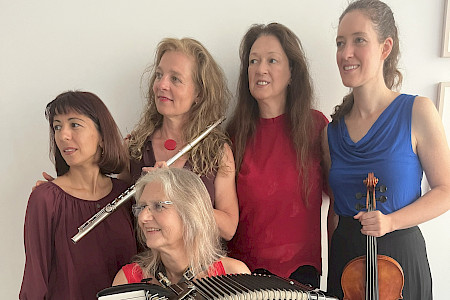 Musikerinnen der GEDOK präsentieren Kammermusik, fußend auf Bach, und mehrere Uraufführungen für Stimme, Flöte, Violinen, Viola, Akkordeon.