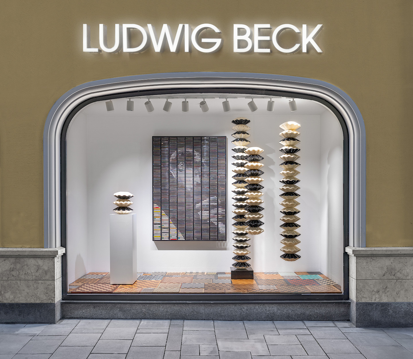 Im Schaufenster von Ludwig Beck zeigt Gregor Hildebrandt drei schwarz-weiße Schallplattensäulen, rhythmisch nach der Klaviatur angeordnet und einen Kassetten-Setzkasten mit einem Portrait von Glenn Gould als Hommage an Johann Sebastian Bach. Buchstäblich ist die Installation von Gregor Hildebrandt aus bearbeiteten Tonträgern (Kassettenhüllen und Vinyl-LPs) zusammengesetzt. So formalistisch die reduzierten Arbeiten auch wirken, sind sie doch voller Nostalgie, denn die Musik wird – zumindest auf diesen Tonträgern – nie mehr abgespielt werden können.